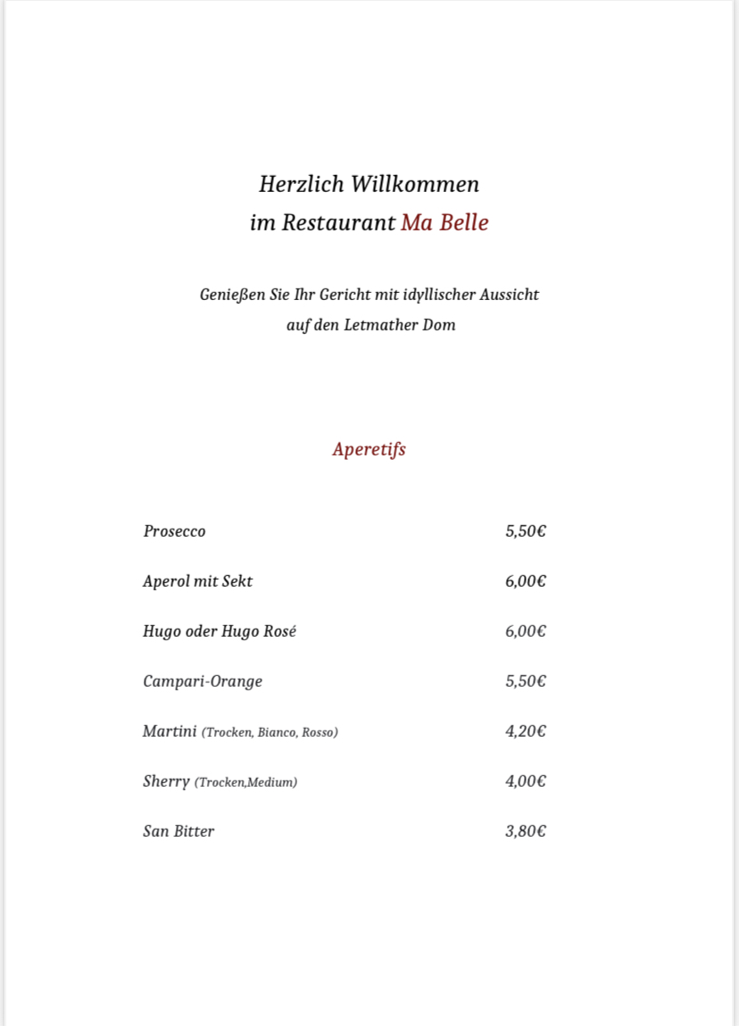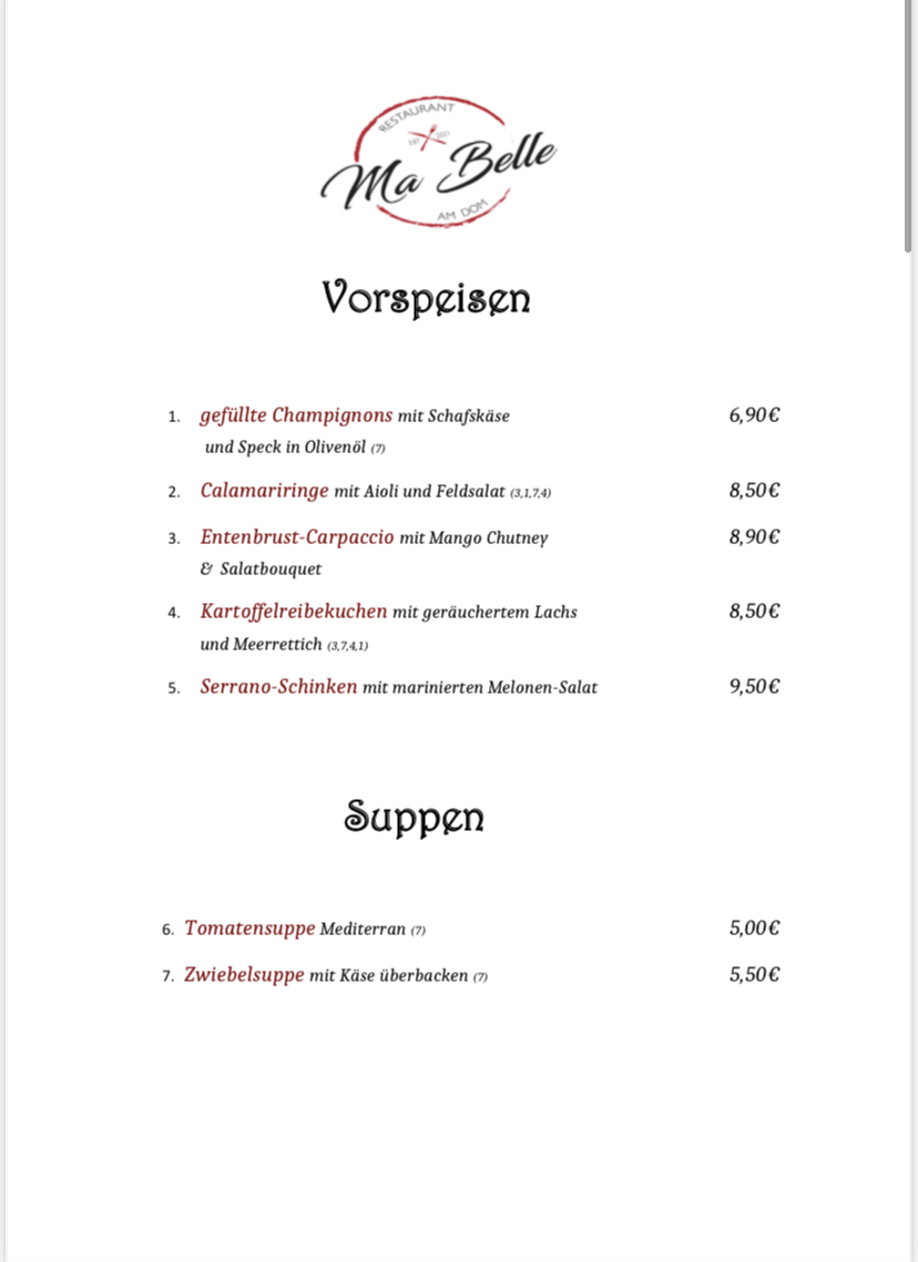 Restaurant Ma Belle Menu
